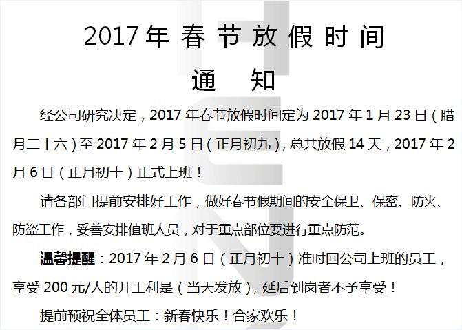 春節(jié)即將來(lái)臨,漢高機(jī)械決定在2017年1月23號(hào)開(kāi)始放春假,有關(guān)各種業(yè)務(wù)的客戶請(qǐng)注意請(qǐng)注意請(qǐng)注意,為避免假期期間可能造成不必要的損失,請(qǐng)?zhí)崆鞍才藕霉ぷ?,重要的事情說(shuō)三遍!