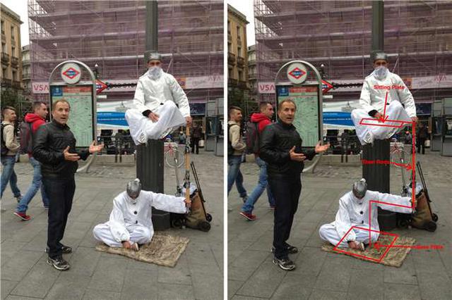 再來是剛剛讓人好傻眼的雙人版本!看到這兩張圖片,大家都能理解吧。哈哈,原理很簡單吧?所謂的街頭人體懸浮術(shù),人體懸空魔術(shù)都是假的,都是利用工具弄成的假象 ,沒有人能夠打破科學(xué)常理。