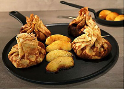 形狀像燒麥,外層是可麗餅,里面填充了各種香料和水果,比如香草、草莓、蘋果等。